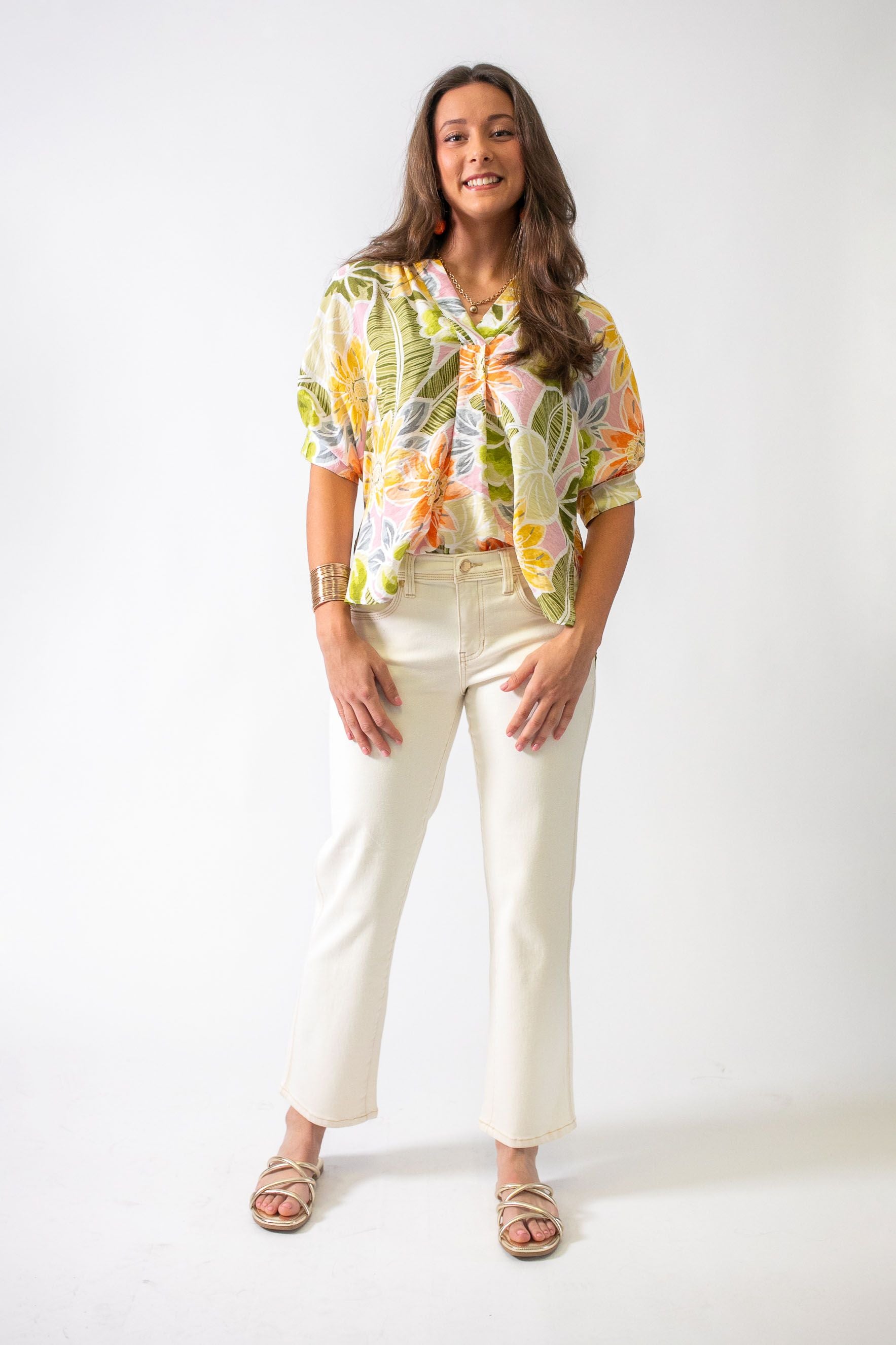 Add a pop of color to your summer with the Ivy Jane Tropical Floral Popover. With its vibrant print, V-neckline, and airy half sleeves, it’s the perfect blend of style and comfort for any sunny-day outing.