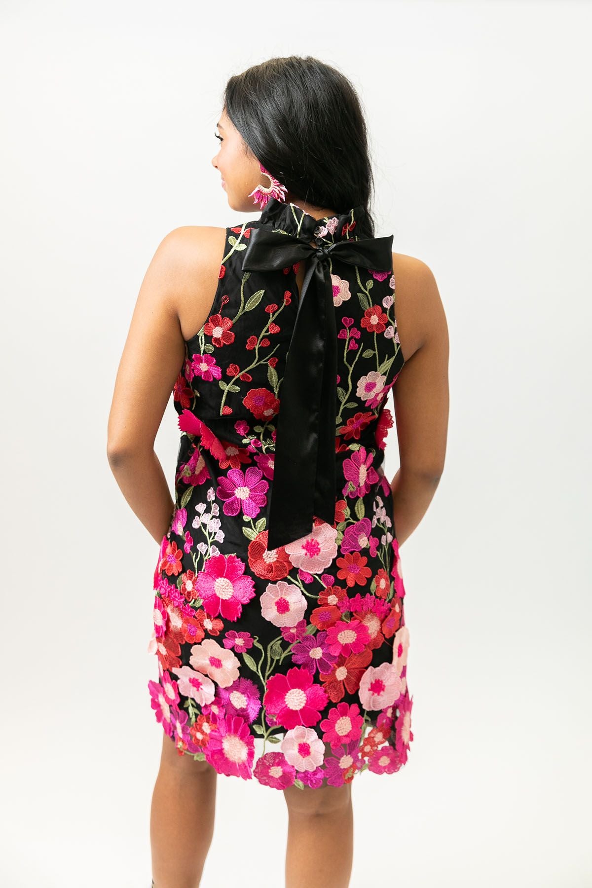 The vibrant floral print adds a fresh, lively touch, while the halter neckline highlights your shoulders beautifully. A playful black bow ties at the back, adding a charming detail that enhances the overall silhouette.