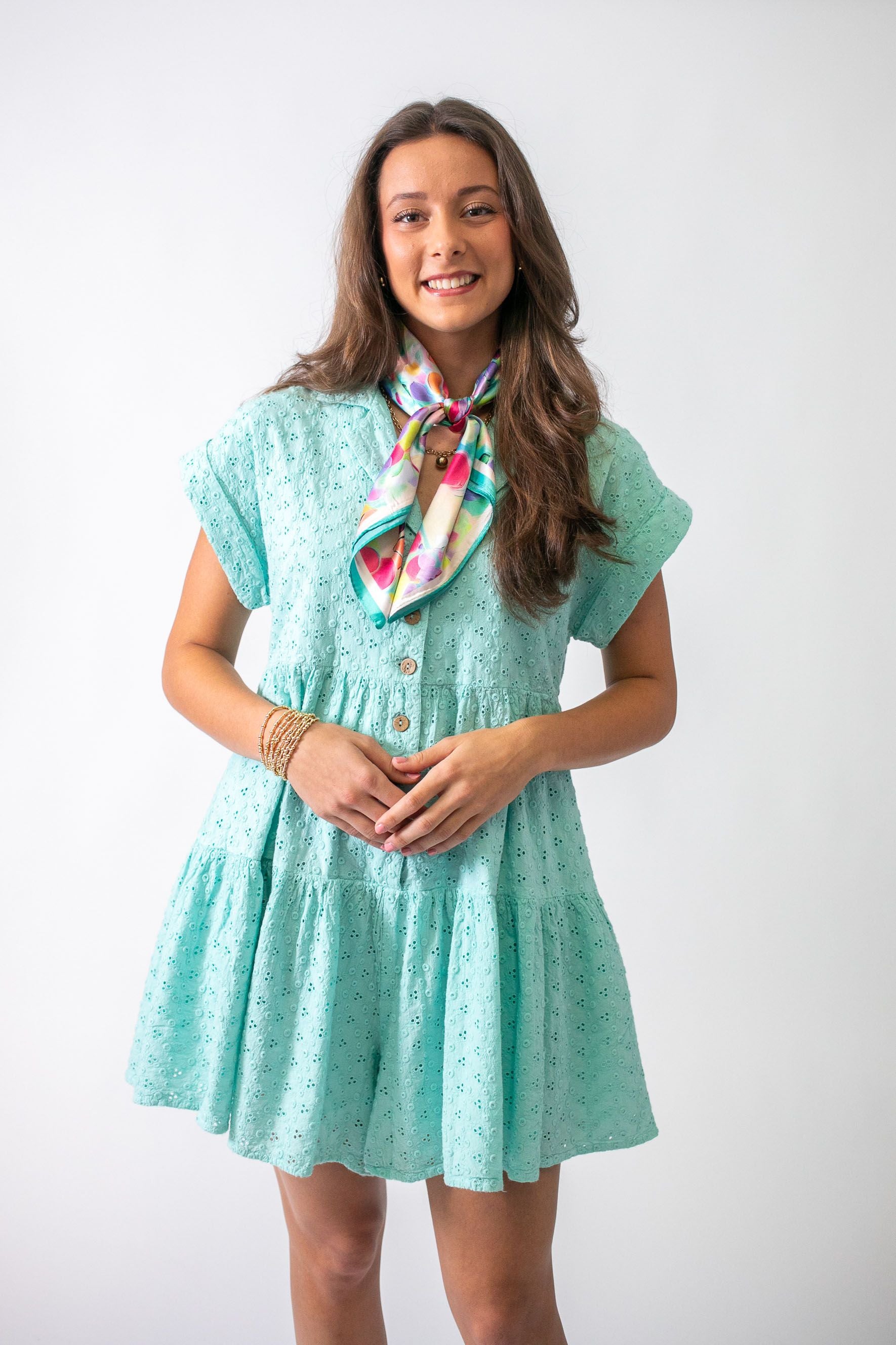 Stay cool and stylish in the Ivy Jane Eyelet Romper. In a fresh seafoam hue, it features delicate eyelet fabric, a collared button-up front, and cuffed short sleeves. With pockets for practicality, this romper blends charm and comfort for effortless warm-weather wear.